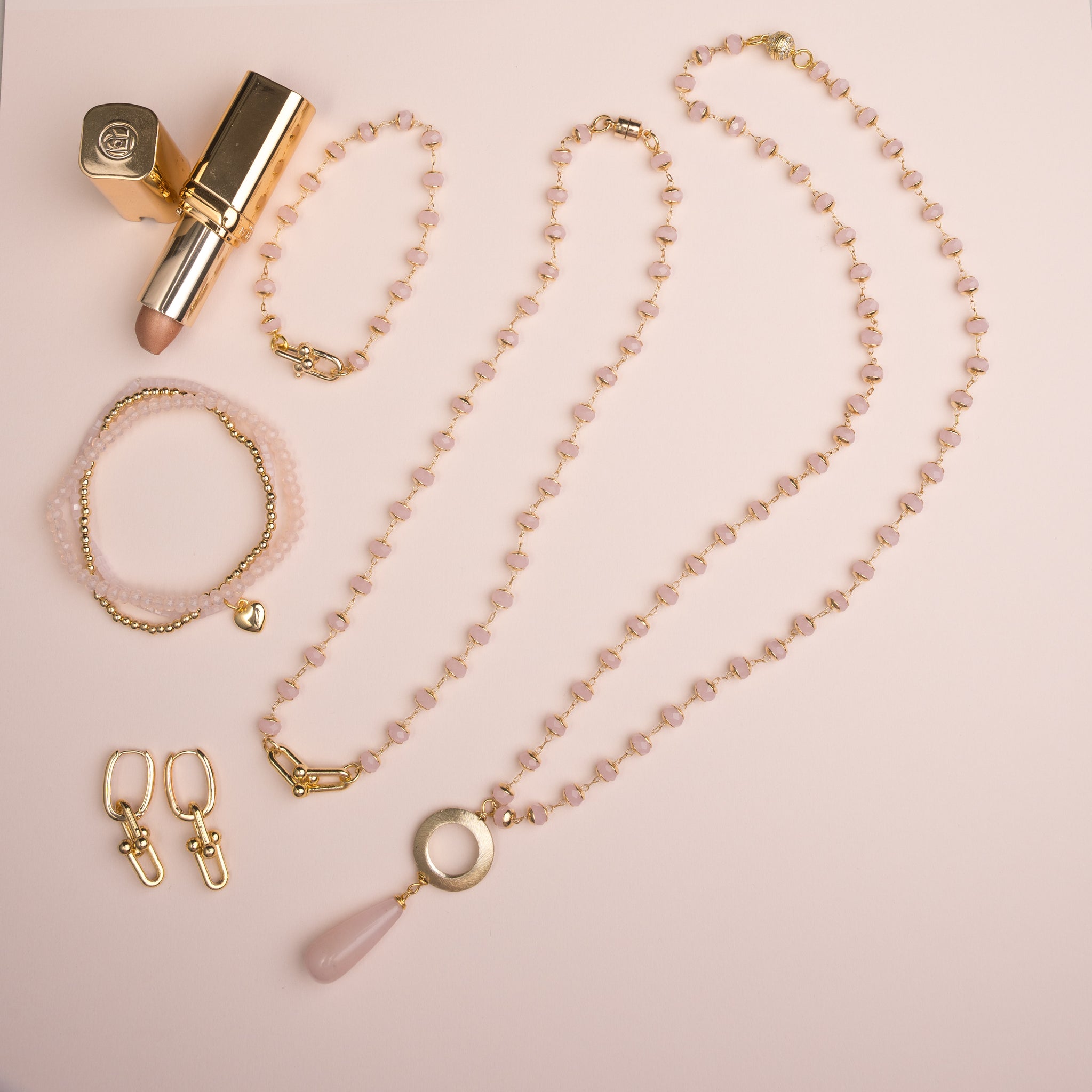 | blush crystal, 18K gold, gold heart charm, set of 3 bracelets |