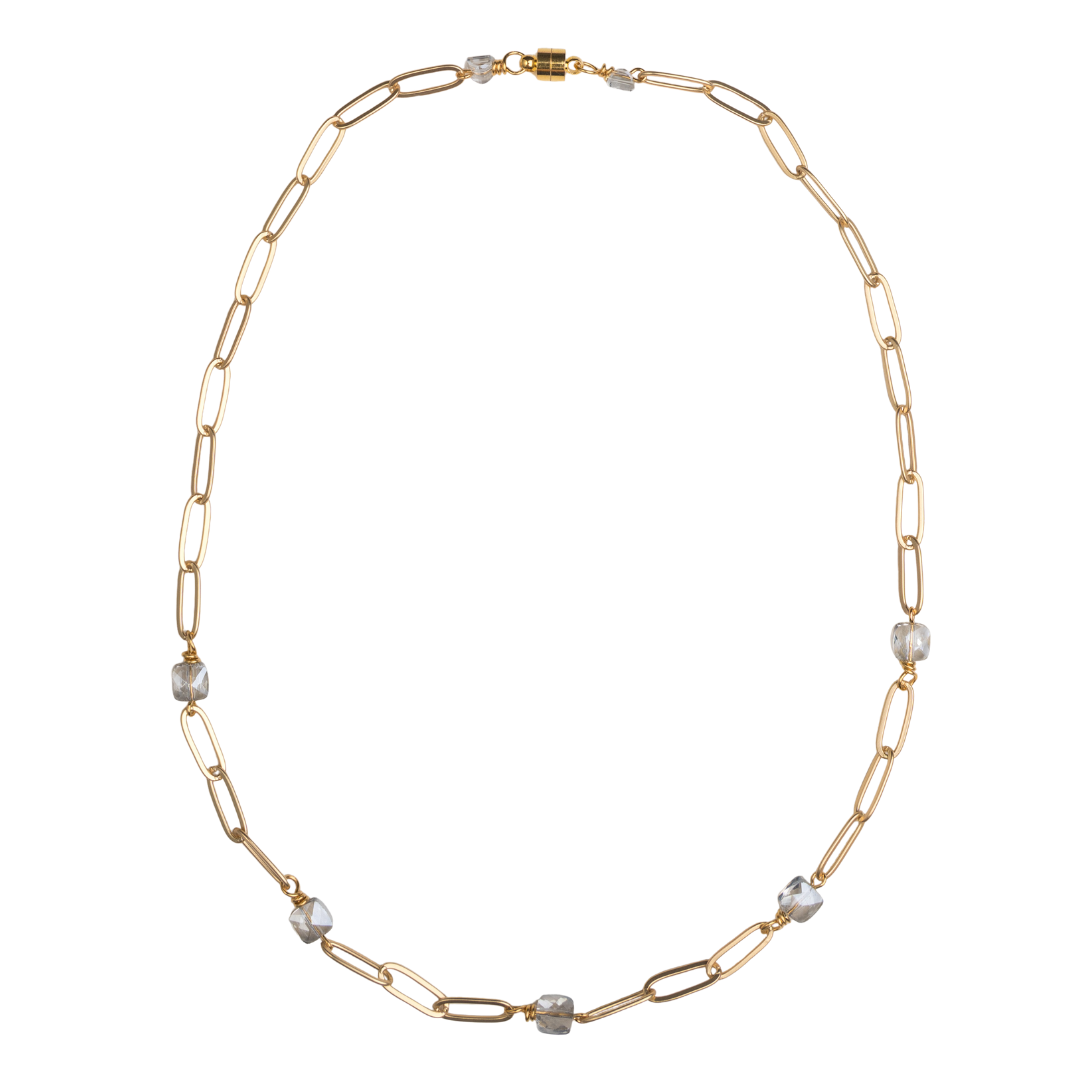 | ice blue crystal, matte gold paperclip chain necklace |