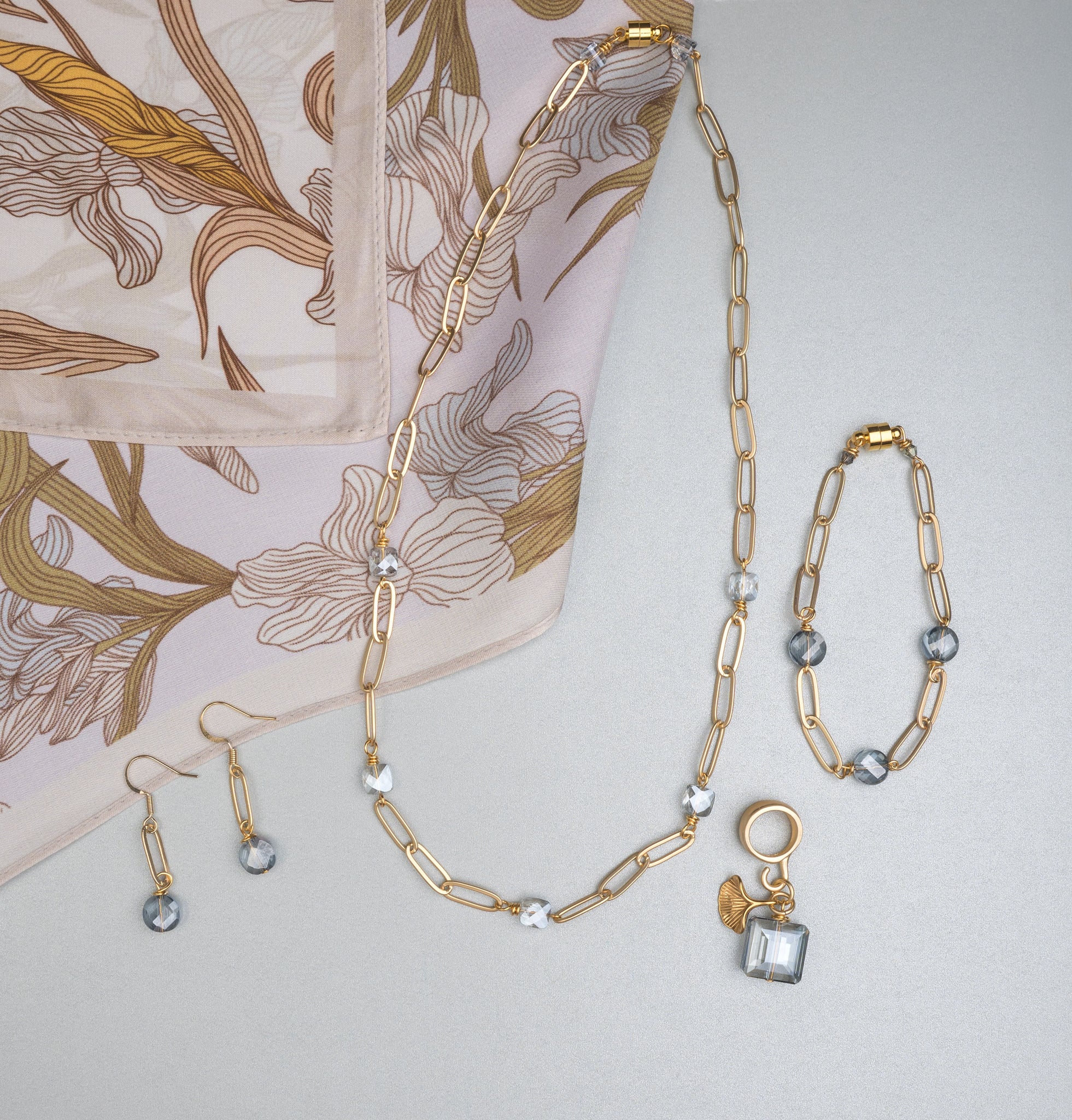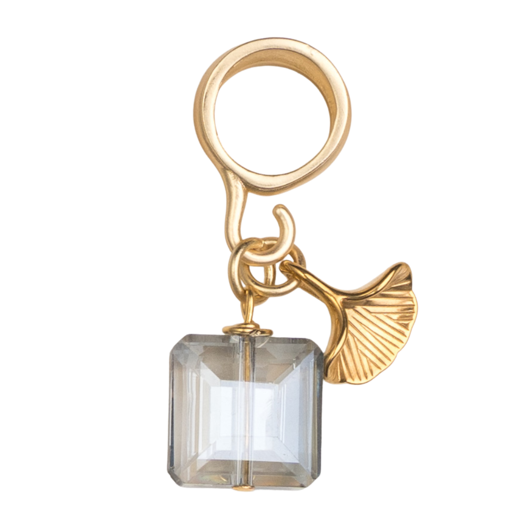 | scarf bail, ice blue crystal, gold ginko leaf charm |